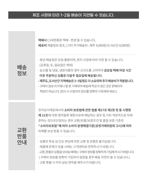 · 배송은 입금확인된 날짜로부터 1~3일 소요되며 최대 7일 이내 제공됩니다. ( 공휴일, 기상악화 등 불가피한 상황에 따라 추가 지연될 수 있습니다.)